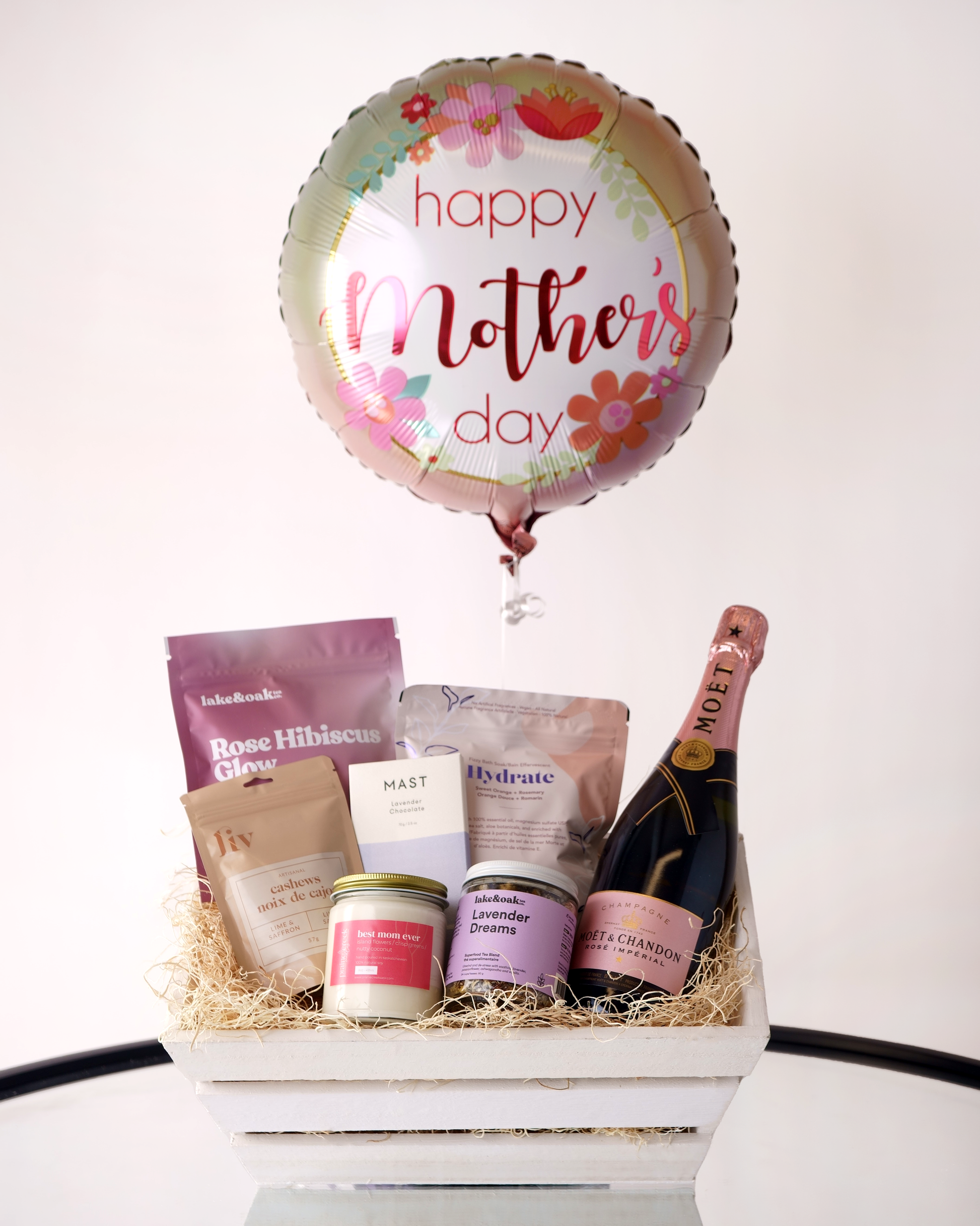 Featuring an artisanal luxury candle in the scent "Best Mom Ever!" from woman-owned Prairie Creek Candles, a lush variety of Lake and Oak superfood tea blends, Hydrate brand bath salts, decadent Mast chocolate, and artisanal hand-roasted flavoured cashews from woman-owned Liv Artisanal. Your choice between a bottle of wine or champagne is added. Topped off with a classic Mother's Day foil balloon, this is a gift that mom will adore!