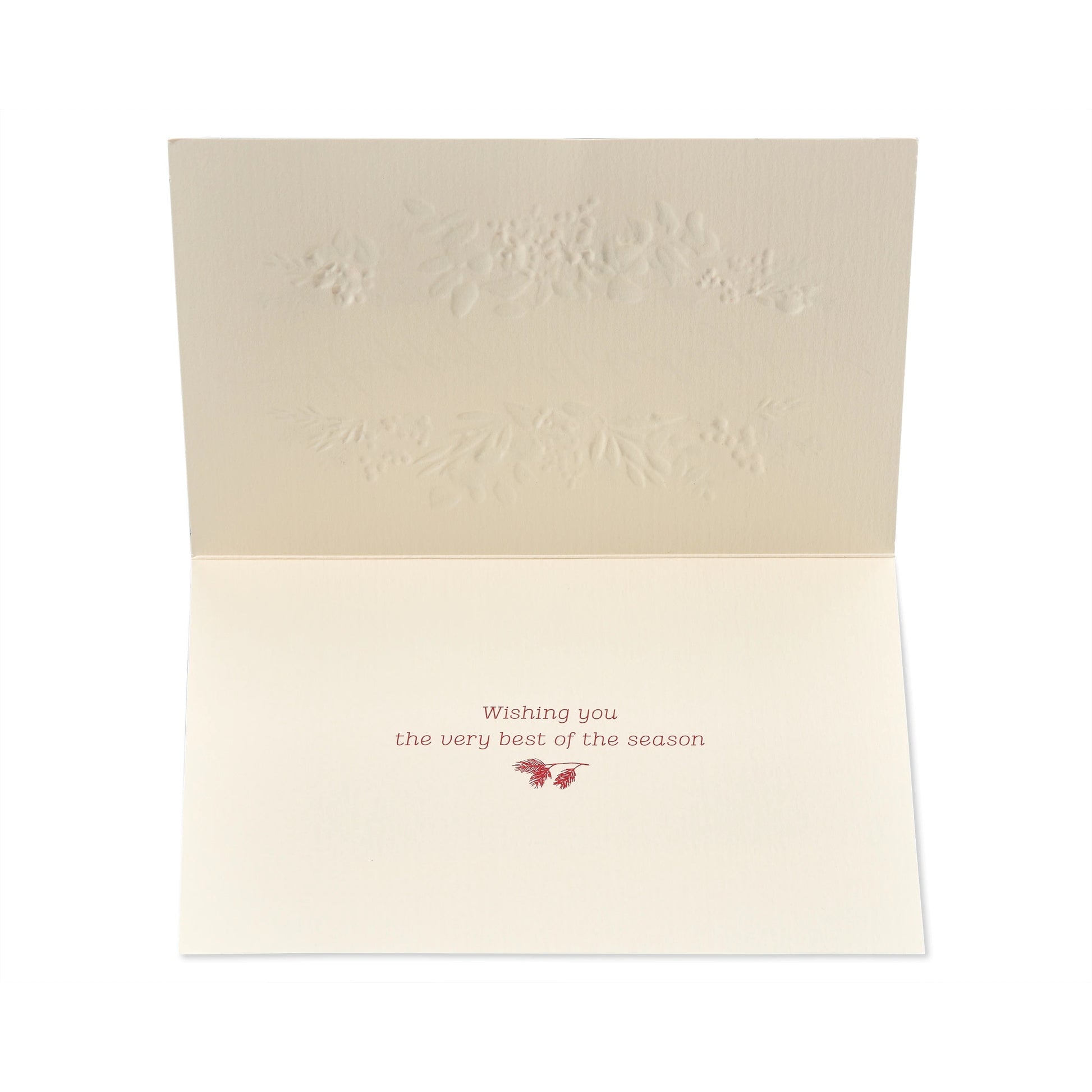Bring smiles to those closest to you this holiday season with this beautiful holiday greeting card! Features an elegant and classic horizontal design, with a festive garland border and hand-lettered wish in traditional reds, greens, and golds. Simple, uncluttered, yet festive and filled with holiday spirit! Added details like metallic foil accents and embossing enhance this premium design.
