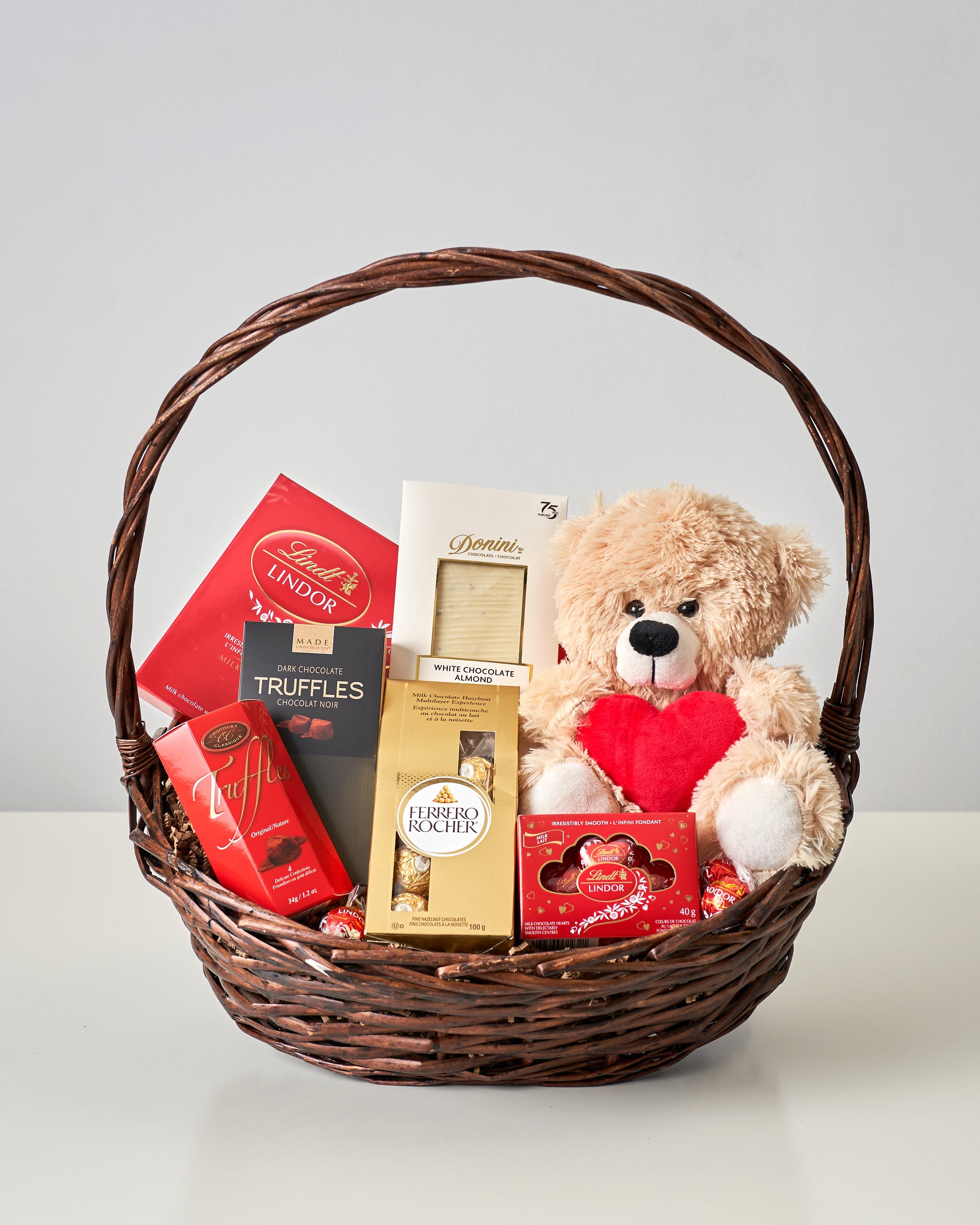 Celebrate with a romantic gift basket filled with an assortment of hand-selected treats, including chocolate truffles, Lindt chocolate, Donini Chocolate bar, and sweet treats. The basket also includes an adorable Teddy Bear holding a heart, making it the perfect expression of love and affection. Indulge in sweet treats and share the love with your special someone.